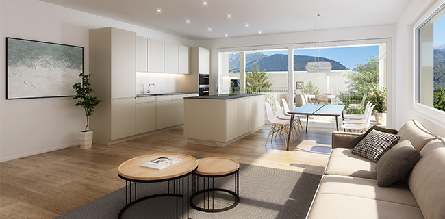 Die sorgfältig ausgewählte Ausstattung mit hochwertigen Materialien überzeugt auf den ersten Blick. Bei genauerem Hinsehen bietet das Wohnen im Pizolblick viele weitere Vorzüge. Zudem ermöglichen Änderungen an der Ausstattung eine individuelle Anpassung an Ihre persönlichen Wohn(t)räume.